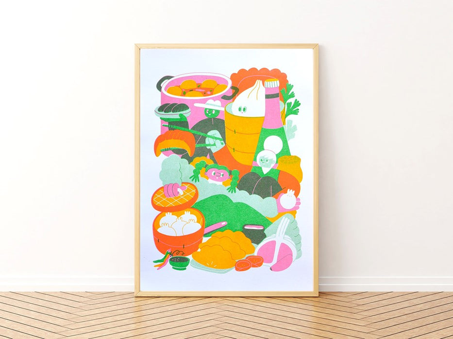 'Dumpling Club' A4 Risograph Print, 3 Colours. 160gsm Echo paper, made from 100% recycled post-consumer waste. Riso is an eco-friendly print process with a unique aesthetic. Prints are signed and packaged with a card backing and biodegradable cello sleeve.