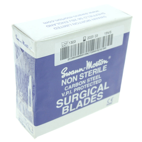 Swann Morton Box of 20 packs of 5 (100 units) No.15 spare blades. Compatible with handles No.3, B3, B3L, 5A, 7, 9 and retractable handle.