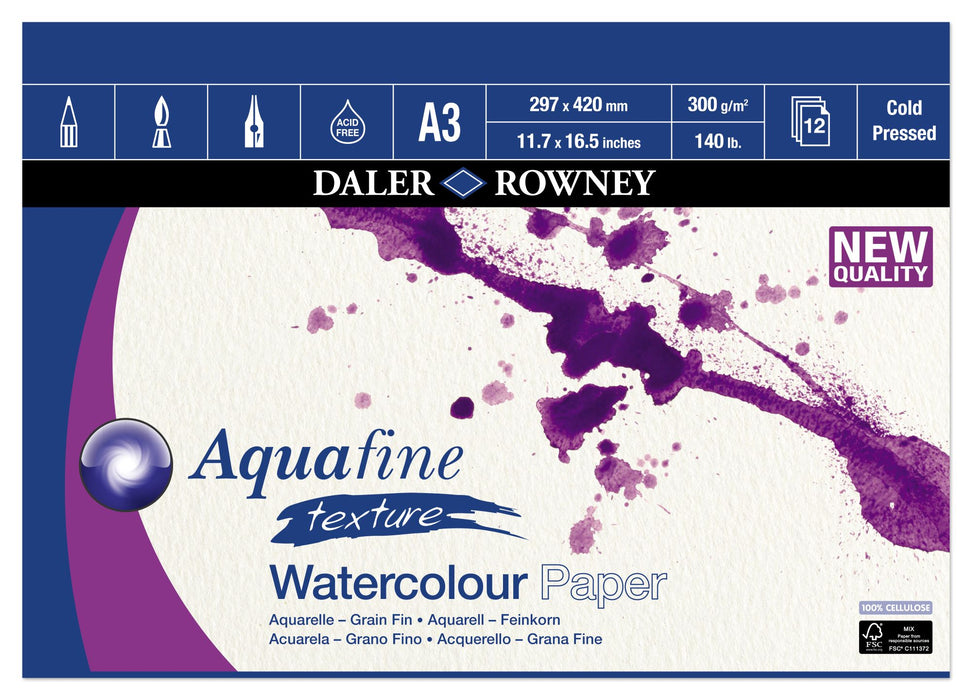 The demanding techniques of water colour painting require high performance papers, specially sized to accept colour and withstand repeated application of washes. All watercolour papers and boards selected by Daler-Rowney are made from the highest quality wood pulp and cotton fibres, and they are all acid-free to prevent discoloration over time. The surface texture of watercolour paper plays an integral part in the overall character of the painting.12 sheets watercolour pad. Acid Free 420mm x 297mm 140lbs,300gsm Grain Fin Cold Press NOT