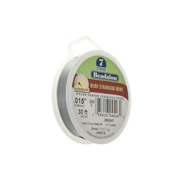 Craft Series bead stringing wire. 7 flexible strands, nylon coated stainless steel. Diameter 0.38mm (.015"), can hold up to 7kg (15lb). Colour Bright, Length 9.2m (30ft). Use crimp bead #1 or tube #2.
