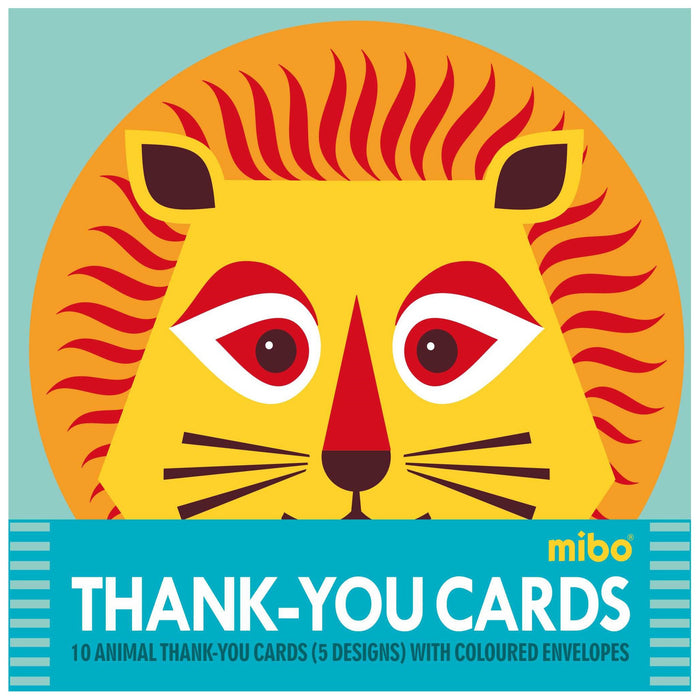 The striking colours and shapes of these Thank You cards make them irresistible. Two each of five designs; Lion, Polar Bear, Owl, Chimp and Wolf in each pack. Includes coloured envelopes. 10 cards 160 x 160 10 coloured envelopes 165 x 165 mm