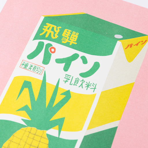 A 30 × 40 cm risograph print of a box of pineapple juice. Printed in multiple colours using soy ink on Biotop 250gsm paper.Each risograph print fea...