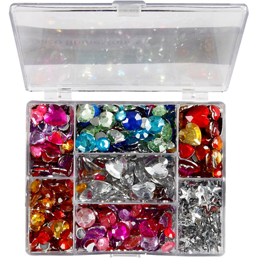 CreativMixed rhinestones with a flat back. A total of 3 designs in various sizes and colours in clear box with practical layout and lid. Rounds. stars. he...