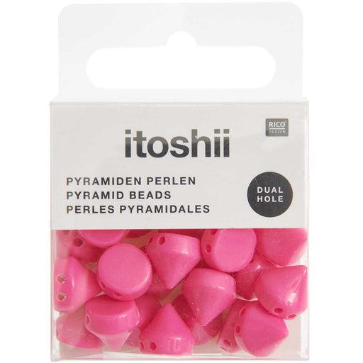 RicoPyramid beads, round, neon pink, 24 pcs, 10 x 10 mm, 4 holes