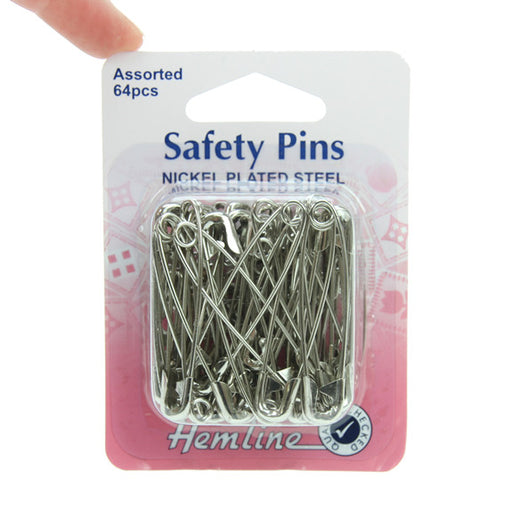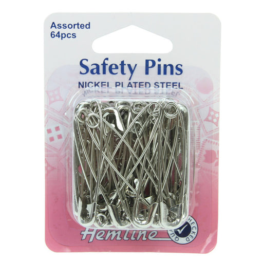 Hemline Safety Pins 64pk Assorted Nickel Plated