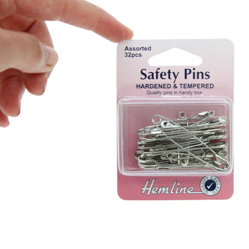 Hemline32 pieces safety pins pack. Hardened and tempered. Assorted sizes.