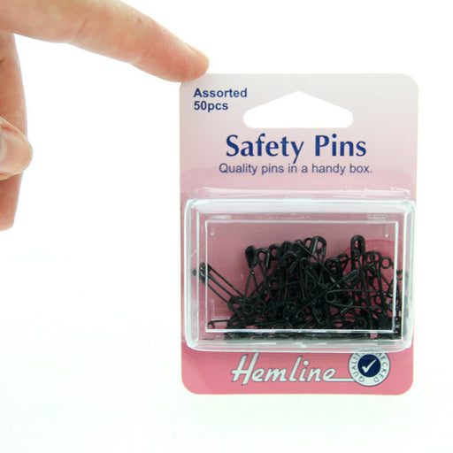 Hemline50 pieces black safety pins. Assorted sizes. 19mm, 23mm, 25 pieces each.
