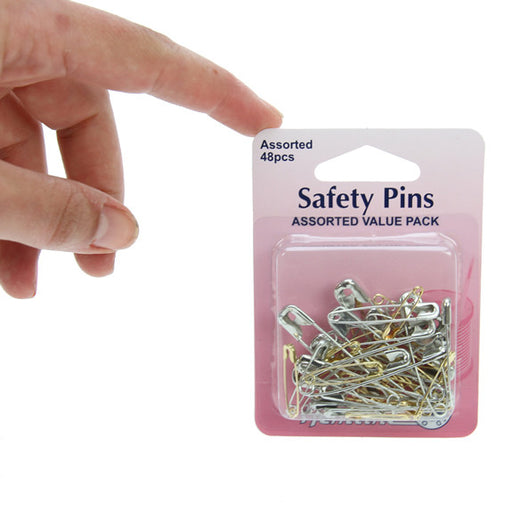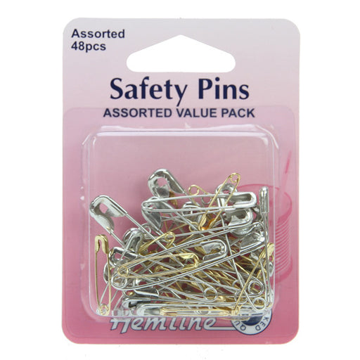 Hemline Safety Pins 48pk Assorted Sizes, Gilt/Nickel Plated