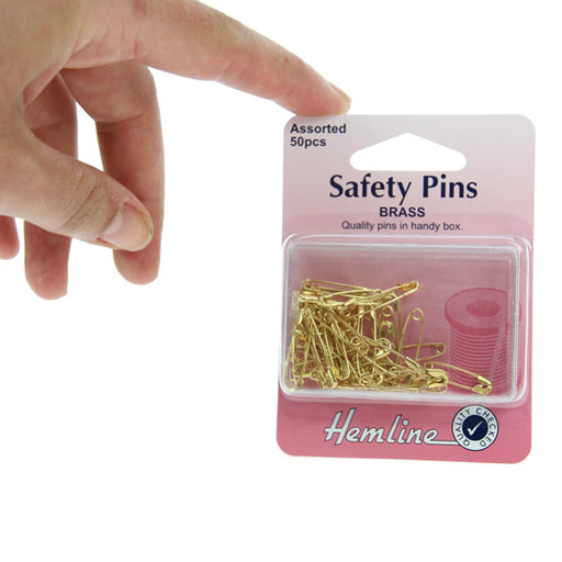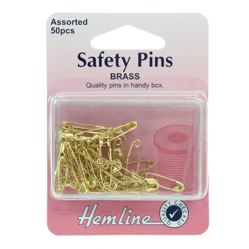 HemlineBrass safety pins, 50 pieces, assorted small sizes.