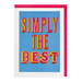 Our letterpress greetings card with a bold blue background featuring the words 'Simply The Best' in pink and orange font. This card has been designed by Thomas Mayo.