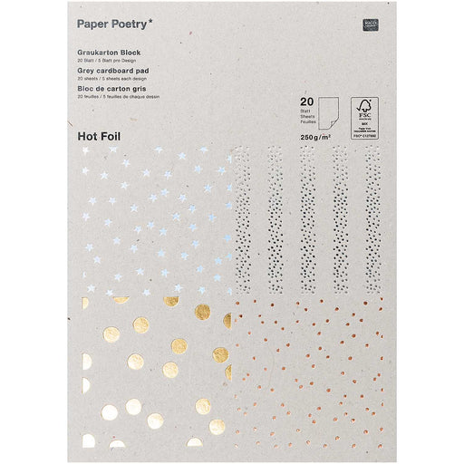 20 sheets of 250gsm, A4 grey card with assorted hot foil designs.