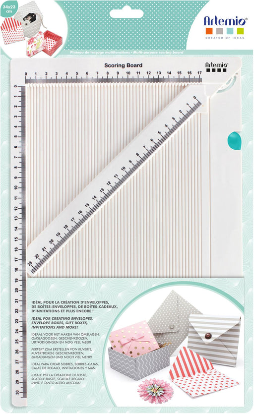 The folding and scoring board is a tool to easily create envelopes, gift boxes and invitations It measures approximately 34.5 cm x 23 cm