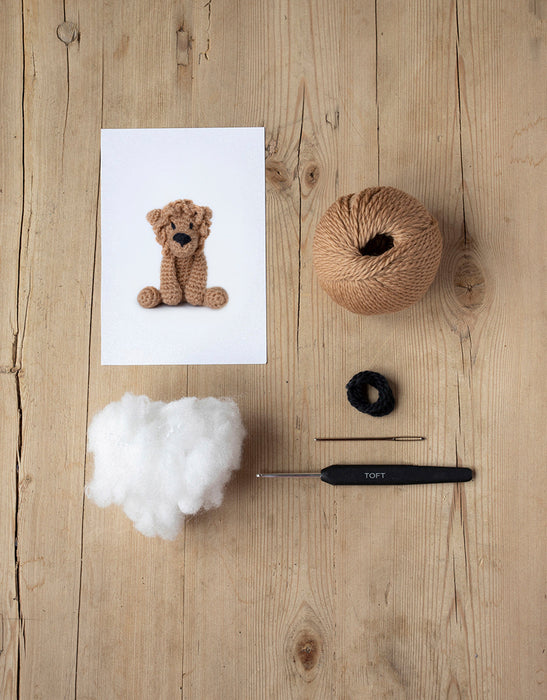 Each boxed kit includes everything needed to complete the project: 100% wool luxury yarn, hook, needle, stuffing, eye threads and pattern with QR video link for lessons for all the techniques.