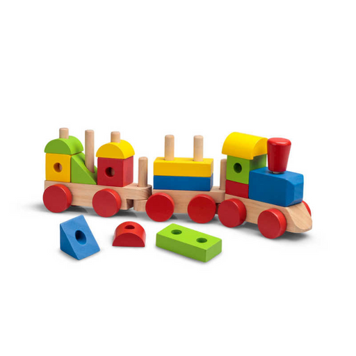 Classic wooden shape stacking train with electronic train sounds. Each train carriage features a set of wooden pegs that each shape slides over, allowing the pieces to be stacked and built-up on top of one another. Push down on the funnel and one of three authentic train sounds will play. It's a fantastic new spin on a classic toy.