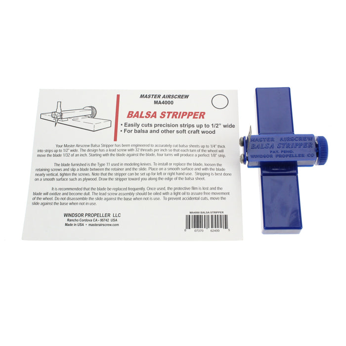 Cutting tool for balsa and soft craft wood strips. Easily cuts precision strips up to 1/2” wide. Master Airscrew Balsa Stripper has been engineered to accurately cut balsa sheets up to 1/4” thick into strips up to 1/2” wide. The design has a lead screw with 32 threads per inch so that each turn of the wheel will move the blade 1/32 of an inch. Starting with the blade against the blade, four turns will produce a perfect 1/8” strip.