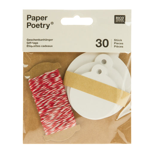 30 gift tags, 10 each of 44mm, 52mm and 62mm diameter. Includes red and white string.