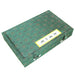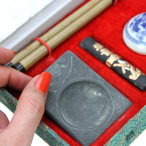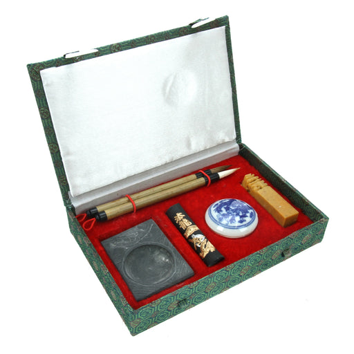 Chinese painting set with a rigid fabric covered case. Painting set includes: 2 Chinese brushes, black ink stick, Soap Stone, stamp ink in a china pot, carved ink stone.
