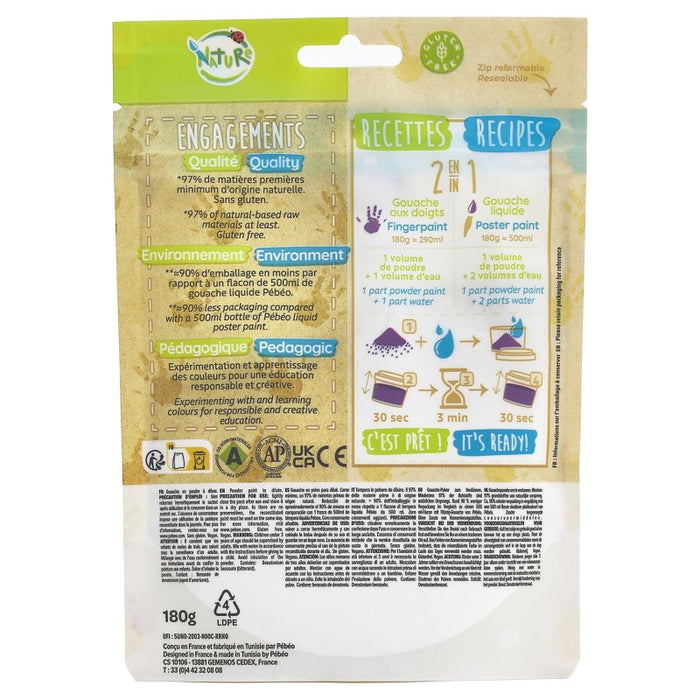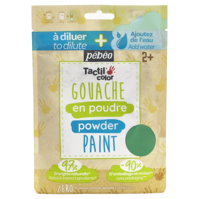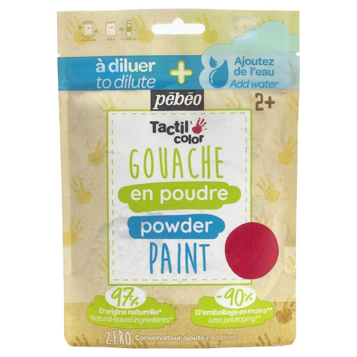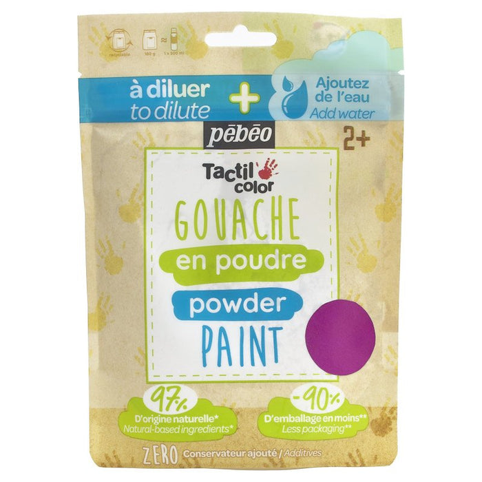 100 g resealable bag of Tactilcolor concentrated powder gouache for dilution, specially developed for schools and groups. Use 160 g of product to reconstitute approximately 280 ml of finger gouache or 5000 ml of liquid gouache.