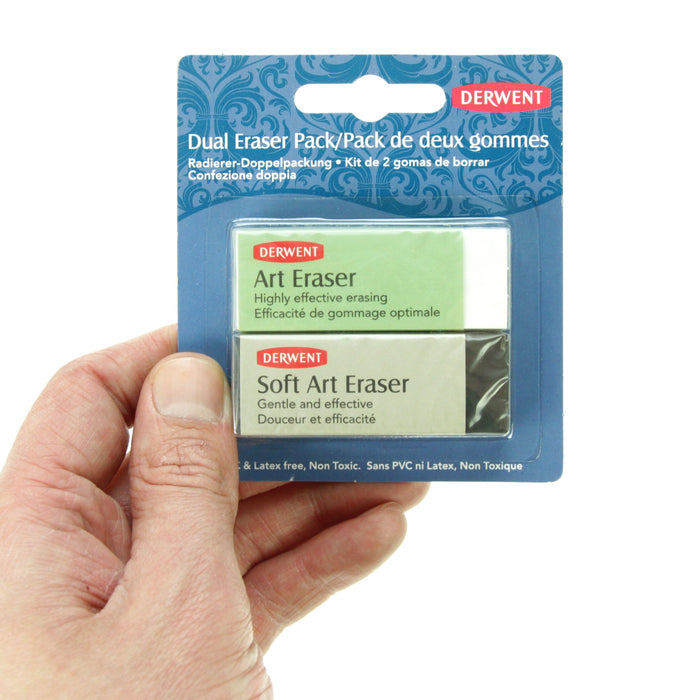 The 2 erasers in this pack provide highly effective erasing for all types of pencils; for less harsh lines use the Soft Art eraser.