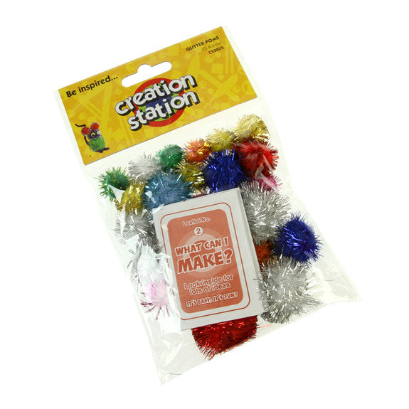 This bag of assorted sized and coloured glitter poms will bring your cards or collage to life. This is a very fun-ctional craft product with many uses. Contents may vary. Approx 25 pieces. Sizes range from 15mm - 35mm.
