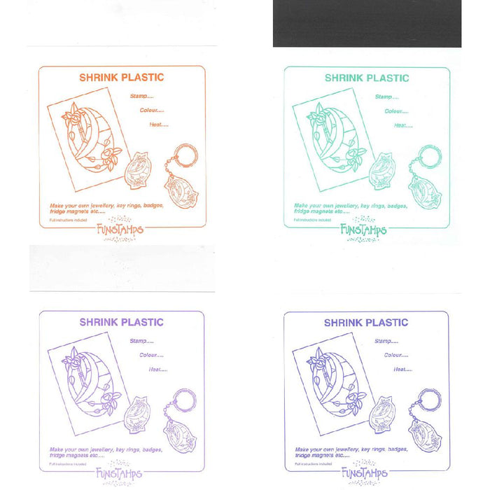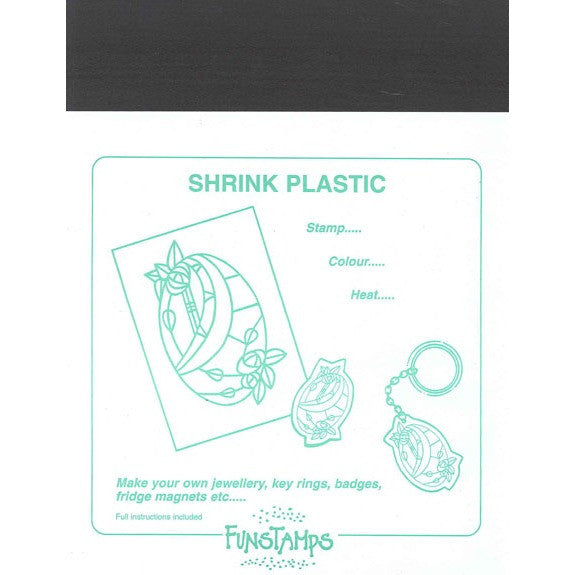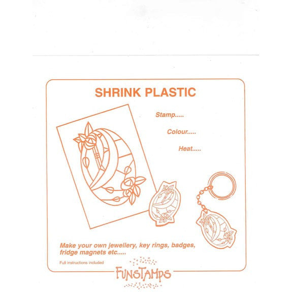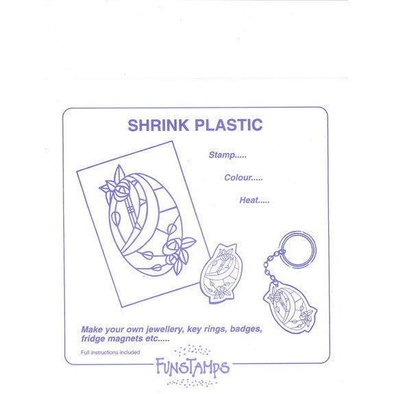 The pack contains 6 sheets 20cm x 26cm in size.Stamp an image onto the rough side of the sheet using a Light Mettallic ink pad or Light Colour Versacolour pad.Allow to dry .The image should not exceed 13cm x 10cm in area.Take into account that your picture will be 7 times smaller.It can be heated in a coventional oven or using a Heat Tool.