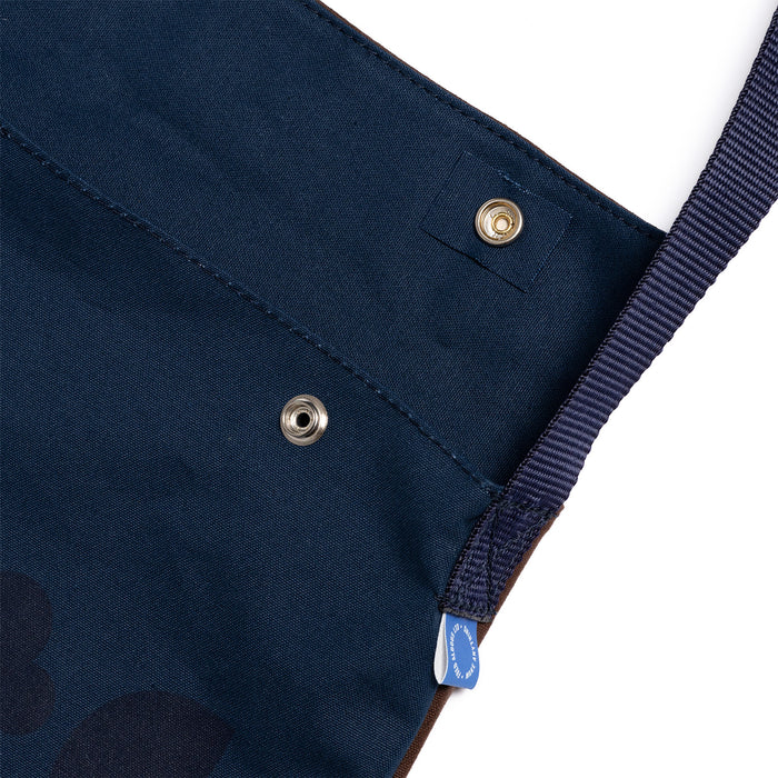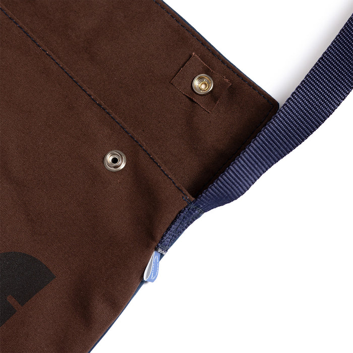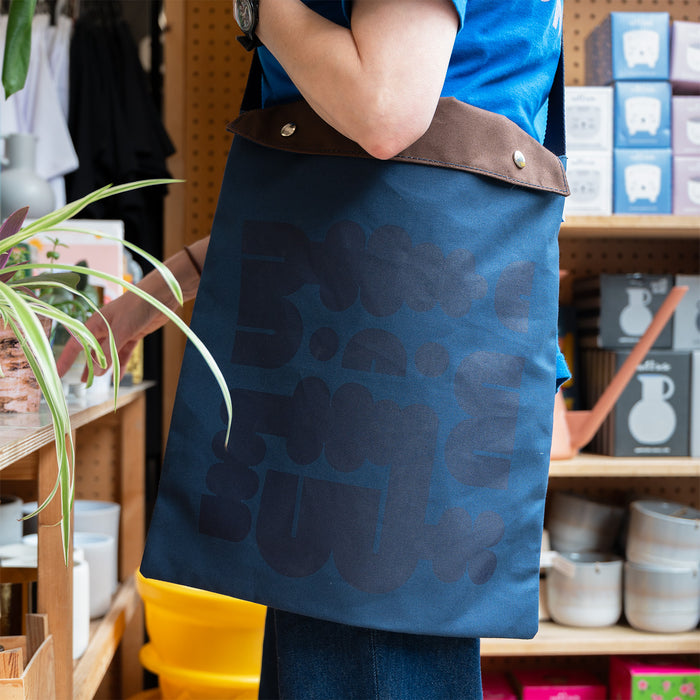 This tote features two complementary tones of showerproof cotton duck canvas, a comfortable wide strap, and one main compartment that fits an A3 sketchbook or your daily essentials. Two sturdy pop studs secure the top opening. Each tote is handmade by our talented bagmaker and friend of the shop, Barney (Bits By Be), with a screen-printed front panel by John using water-based inks.