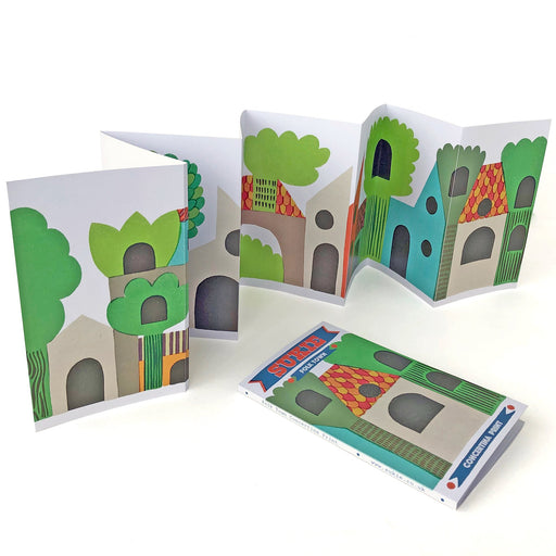 SukieThe 'Folk Town' concertina print featuring an imaginary townscape, a colourful decoration for bookshelf, window ledge, mantlepiece or wall.Printe...