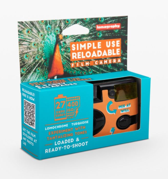 Get that authentic 80s disposable camera aesthetic without creating endless plastic waste. Preloaded with Lomography LomoChrome Turquoise film for brilliant blue and orange hues.
