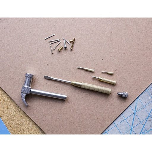 Be ready for any household task with this striking hammer which is also a handy 6-in-1 screwdriver set.The brass handle unscrews to reveal a handsome screwdriver with a rugged grip. Extra driver heads can be stored in the base of the screwdriver. Comes with nickel plated claw hammer head, and two flat head and two phillips head tips.