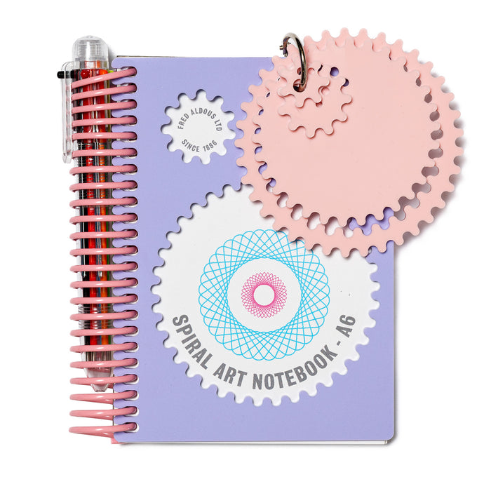 The Fred Aldous Spiral Art Notebook. Combines the classic art tool that has been loved for generations and our rebound notebook. With its interlocking gears and wheels, you can create endless spiralling designs. Contains 48 sheets of 150gsm cartridge paper. Each book is coil bound with a laser-cut acrylic spiral art template. Each notebook includes a six-colour ballpoint pen.