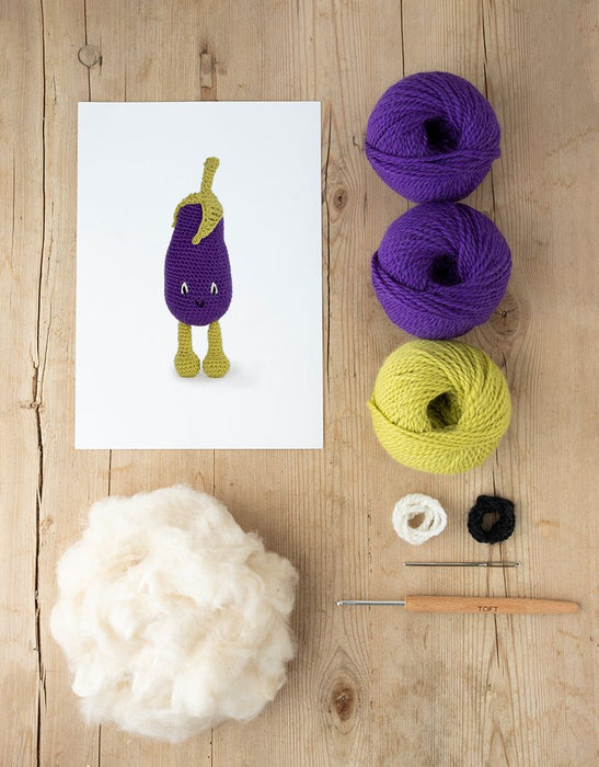 Whether you're looking to crochet your own grocery store, create a still-life display, or entertain the kids with play food, this crochet baby aubergine (or eggplant) is so quick and easy that you'll be well on your way to your five-a-day! With 100% natural ingredients, this kit has everything you need to make this delicious food, including optional eye threads to give your vegetable its personality.