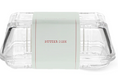 Clear glass butter dish with lid, perfect for keeping blocks of homemade or shop-bought butter fresh. Ideal for storing in the fridge, or serving at the dining table. Decorative ridges on the lid and base, along with the word "Butter", embossed on the top of the lid, give this butter dish a premium and retro look.