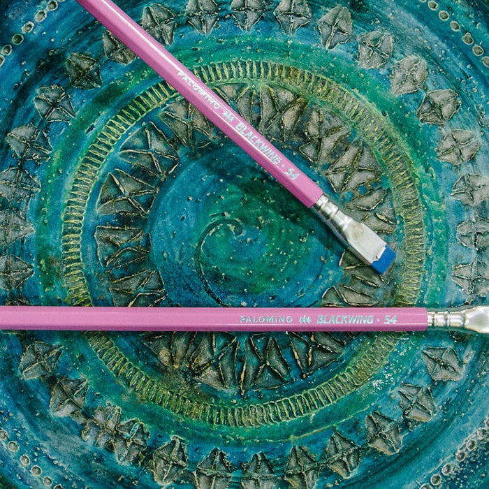 The Blackwing 54 pays tribute to surrealism and creative exercises that force us to look beyond our narrow personal perspective. We designed this pencil using Exquisite Corpse. First, we separated the pencil into five components (graphite, lacquer, imprint, ferrule, eraser). Then, we blindly selected the design for each component and assembled the results. The finished pencil features a rose barrel, teal imprint, silver ferrule, blue eraser and our extra-firm graphite. The number 54 is a nod to 54 rue due Chateau in Paris, the birthplace of Exquisite Corpse.
