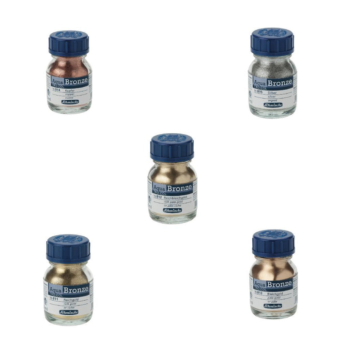 Schmincke Bronzes Aqua are for glossy metal effects in Gouache or watercolour paintings on less absorbent surfaces such as paper, cardboard, painting board or canvas. With a formulation based on real metal pigments for painting in oil, acrylic or watercolour.