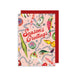 Say merry Christmas with this sparkly card. This card features Christmas decorations surrounded by silver tinsel and reads 'Season's Greetings!'
