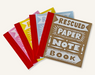 A small square notebook made from assorted used or 'rescued' papers with a colour paper cover screen printed with the words RESCUED PAPER NOTEBOOK, and red cloth spine. The inside pages are folded, so the 'used' side of the paper is on the inside. Papers include end of print runs, packaging prints and assorted paperwork - each book is different depending on the paper available. Front cover colours may vary.