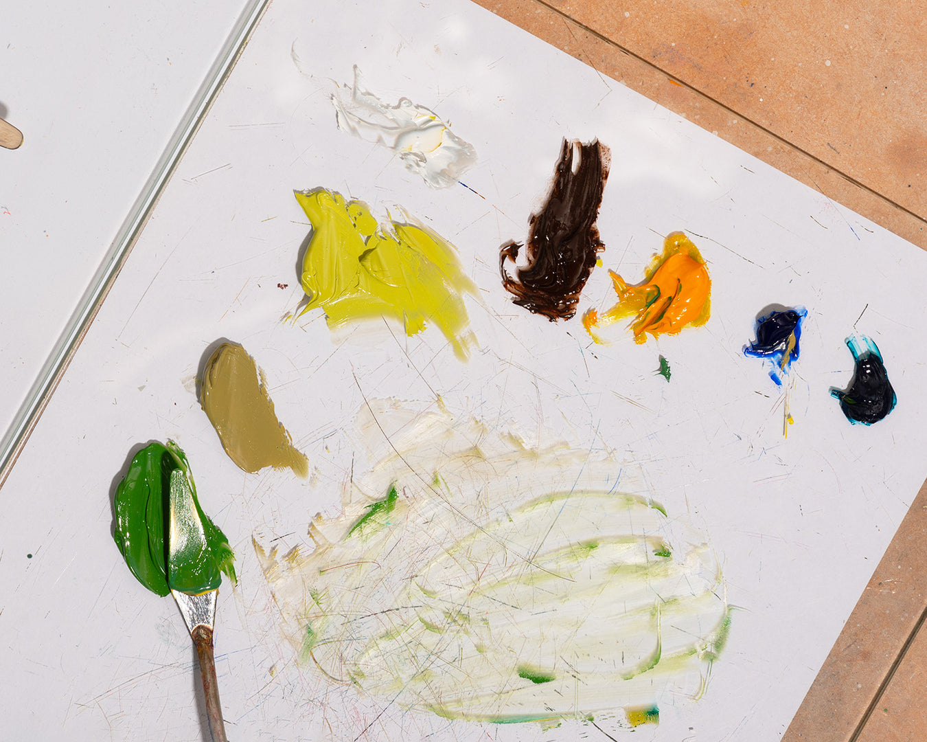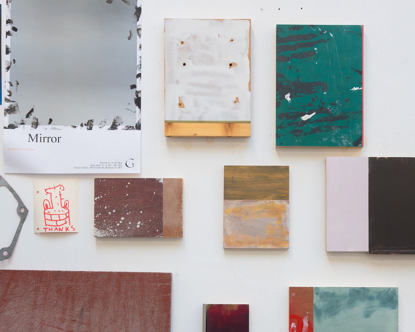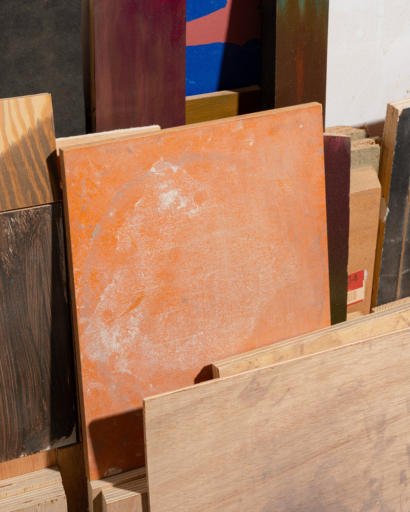 I'm interested in interrogating the creative act as a whole. I think about the creative act as a process that starts with the artist and is completed by the viewer. I'll often use found objects, chance and by-products in an attempt to play with the traditional intent-driven, artist-dependant process of making and see how this might affect the viewer's interpretation. I explore the language of painting to lead the viewer around each piece. Their eyes may bounce between a scratched piece of metal, a stained piece of wood and a gestural brush mark, trying to decipher where these traces are from and if they evoke any response despite uncertainty about my involvement.