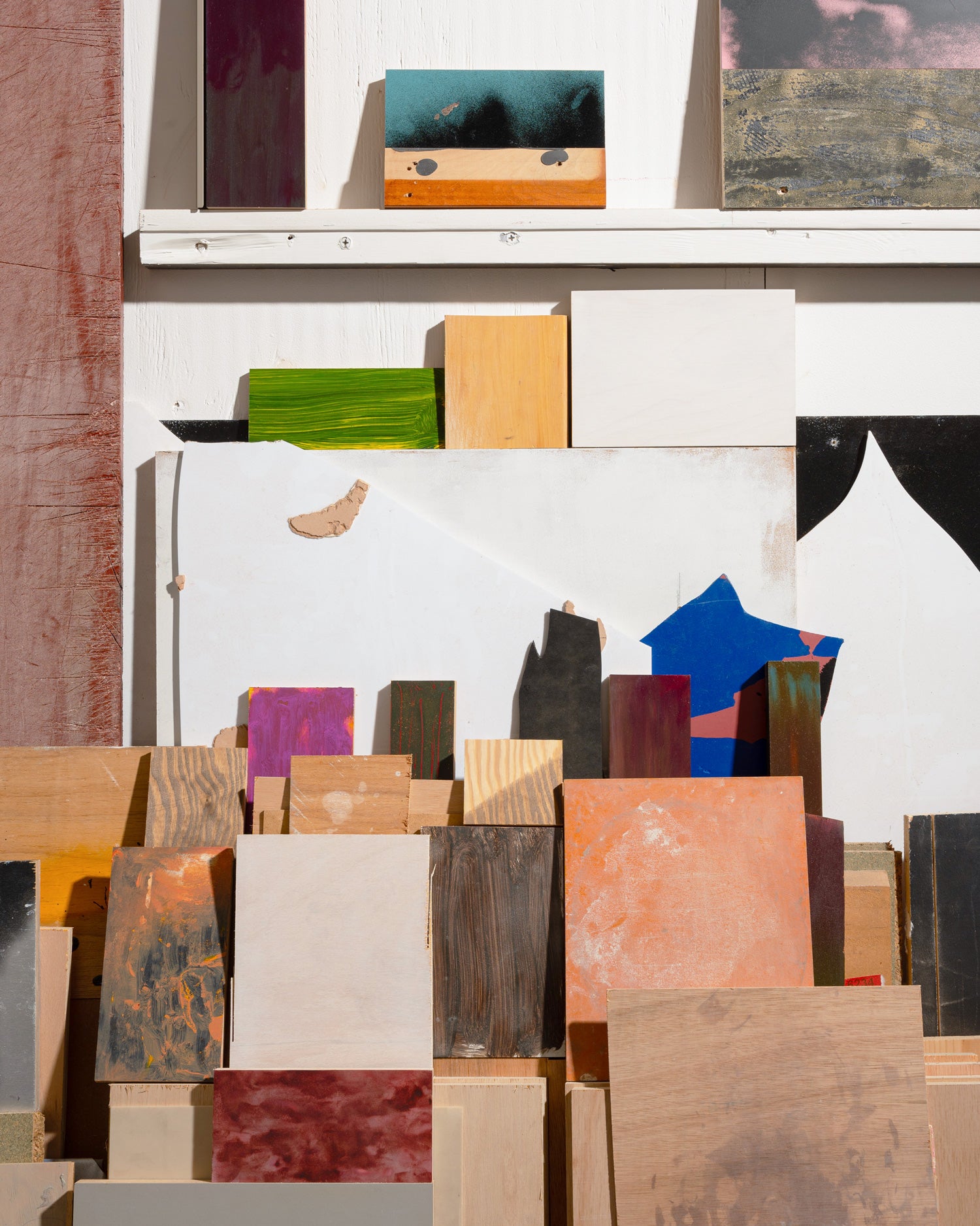 Nothing is off limits, but I tend to be drawn to objects that have painterly qualities and some evidence of human trace. I'm always on the lookout for new materials, poking around in skips or peering down alleys when I'm cycling around town. Sometimes, I'll spot something discarded in a friend's studio and offer a trade. Other times, I'll go out hunting in junk shops. Occasionally, I get a tip-off from a friend who understands my practice and knows the kind of thing I'm looking for. I'll bring these objects into the studio and sit with them, considering what might promote their inherent properties and how they can transition into a successful painting. The aim is to create a self-sufficient artwork that doesn't rely on the artist as an imposing, authoritative figure.