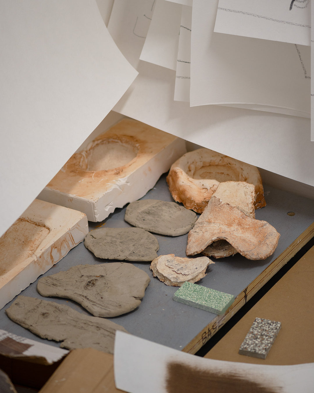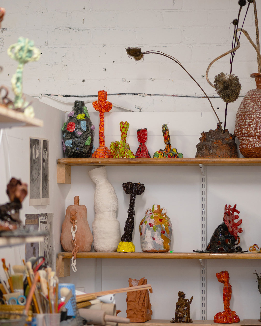 Looking over to that wall behind you, I can see ceramics, woodwork, canvas, perspex, foam and a few more miscellaneous materials. What dictates the materials you use? Do you have a favourite material to work with?