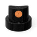 This black with orange dot medium cap is one of the most consistent available, producing a line of up to 8 centimetres in diameter. A great tool for creating thick, wide outlines and filling in large surface areas fast. You can change the spray width by the amount of finger pressure applied to the cap. Use spray cans with different pressure types and valve systems to change the spray patterns also.