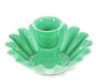 Cast metal candle holder with green enamel finish, with a cupped flower-shaped pan to catch dripping wax. Its simple design and striking colour will look great on any dining table or mantelpiece.