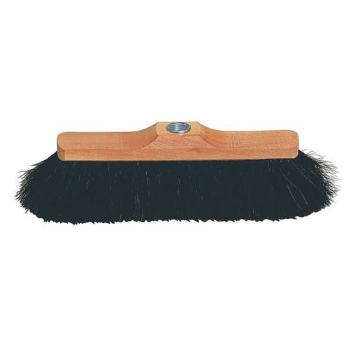 A classic indoor broom head, constructed from oiled beechwood with dark horsehair and a raised top with inset metal thread fixing for pole attachment (available separately). 28.5cm wide.