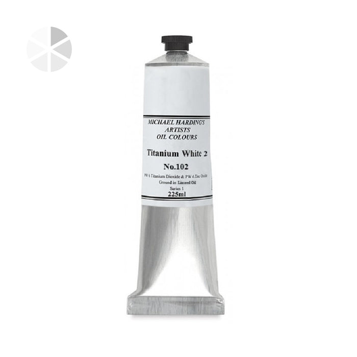 PW 6 & PW 4 | Slow drying time | Very Opaque | Very Low oil content. Titanium White number 1 is the most brilliant white in the Michael Harding range and is suitable for cool, opaque light hues. This white is ground with safflower oil and contains a small addition of Zinc White in order to avert the tendency of pure Titanium Dioxide pigment to exude oil to the surface whilst drying, which in result causes a more pronounced appearance of yellowing. Zinc White incorporates this free oil more effectively, as well as adding a cooler brightness to the white. If you want a strong mixer which tends to lighten hues strongly then this is it. The handling qualities are not overly subtle, but this is the white most suitable for a bright and largely cool palette.