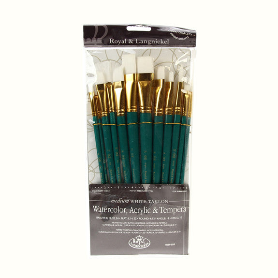 10 pack of good quality white taklon brushes, assorted sizes and shapes, neatly stored in a clear zip lock bag. Suitable for watercolour, acrylic and tempera.