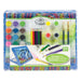 31 piece art set. 12 watercolour cakes, 6 coloured pencils, 6 acrylic paints (3ml), 4 sheets of artist paper, 2 brushes and 1 easel.