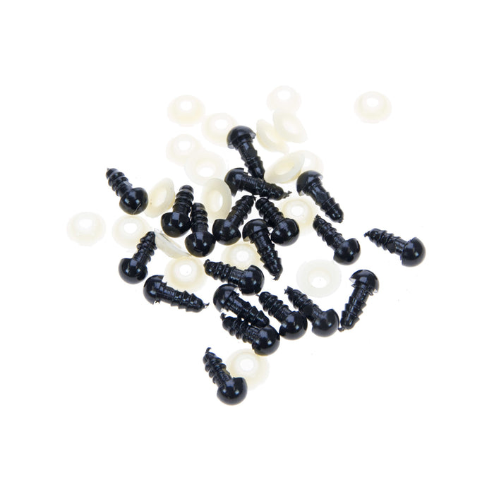 A pack of 10 pairs of black safety eyes. Contains eyes and washers. Suitable for childrens toys. Size 6 mm diameter. Complies with the European standard EN 71 Part 1: Mechanical and Physical Properties, Part 2: Flammability and Part 3: Migration of Certain Elements.
