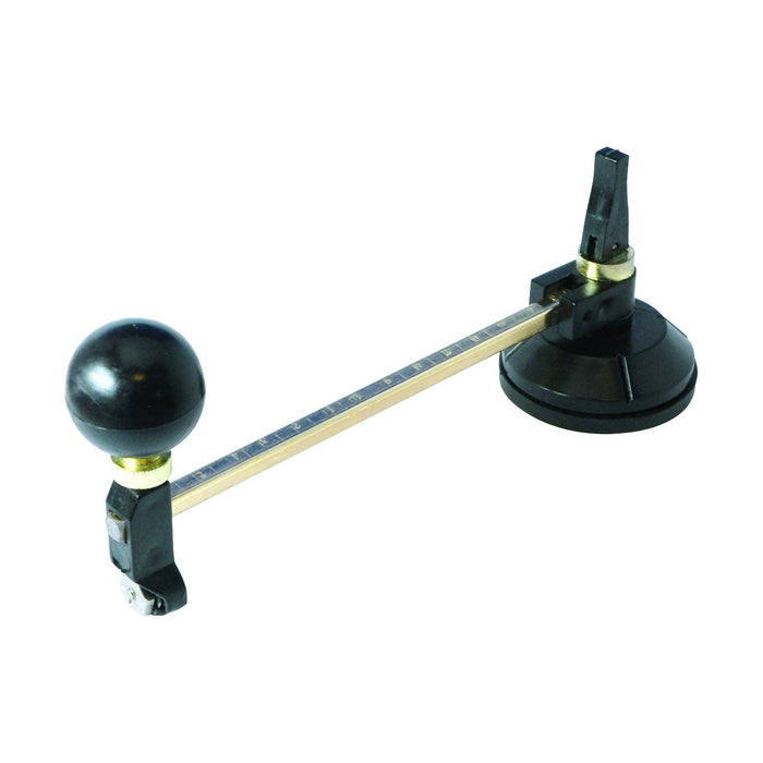 Cuts circles in standard glass from 2-8mm thick and from 65-300mm diameter. 55mm rubber suction pad securely holds blade arm mounting. 6 x tungsten carbide blades on rotating turret extends tool life. Clear metric graduations etched on a brass-plated steel rod. Can be used to cut circle segments. Deeply scores glass to allow easy breakout of glass segments. Rotating handle for smooth circle motion.